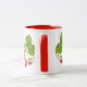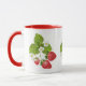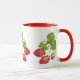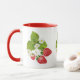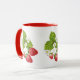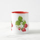 This ceramic coffee mug is shown in a two-tone color of red with a cute summertime fruit of strawberries print.