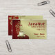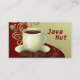 Fun and modern illustration of a coffee cup with coffee beans. The background is in rich tones of gold and red and features scrolls and red hearts. Nice business card for a coffee and doughnut shop or a small cafe.