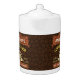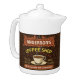 This coffee-themed teapot is perfect for anyone who runs their own coffee shop or has a coffee theme in their home kitchen decor. Done in retro brown, orange, beige and yellow, this espresso / cappuccino inspired design features a cup on a saucer, two personalized text banners and the words "Coffee Shop / Fresh Roast / Great Flavor" in yellow.