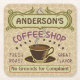 These coffee-themed paper coasters are great for anyone who runs their own coffee shop, has a coffee theme in their home kitchen decor or is throwing a coffee party. Done in retro brown, green, purple and hints of orange, this espresso / cappuccino inspired design features a cup on a saucer, two personalized text banners and the words "Coffee Shop / Fresh Roast / Great Flavor" in purple.