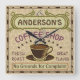This coffee-themed square wall clock is perfect for anyone who runs their own coffee shop or has a coffee theme in their home kitchen decor. Done in brown, green, purple and hints of orange, this espresso / cappuccino inspired design features a cup on a saucer, two personalized text banners and the words "Coffee Shop / Fresh Roast / Great Flavor" in purple.