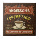 This coffee-themed tile is perfect for anyone who runs their own coffee shop or has a coffee theme in their home kitchen decor. Done in retro brown, orange, beige and yellow, this espresso / cappuccino inspired design features a cup on a saucer, two personalized text banners and the words "Coffee Shop / Fresh Roast / Great Flavor" in yellow.