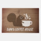 Cute Coffee Lover's Welcome Mat. Squirrel enjoying a steaming hot mug of coffee. A fun doormat for home and business. Makes a great personalized gift for animal lovers and coffee enthusiasts. Customize this original design with your name or slogan. Visit Jenn's Doodle World for even more whimsical welcome mats and cool coffee themed gifts.