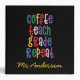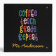 Coffee, teach, grade, repeat teacher modern colorful bright rainbow typography gift. Show your teacher you care with this useful modern Christmas or end of term gift. Very important teacher bits and bobs. With hand lettered modern fun script, and space for their name and the name of your child. The perfect end of year, Christmas or holiday gift for your favourite teacher. The colors of the text and be changed to suit.