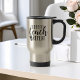 Know a teacher who's powered by coffee? They'll love this cute quote travel mug featuring the saying "coffee, teach, repeat" in black hand lettered typography with a heart-embellished coffee cup illustration.