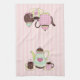 Pretty pink and cream striped kitchen towel, with graphics of tea and coffee pots and cups with saucers, in trendy brown, pink, and green. Customize to add any text you like. Adds a sweet touch to any kitchen.