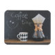 A chalkboard in the back says "coffee time" with a smiley face, written in chalk. In the front on a rustic wooden table is a coffee mug with a diamond pattern design in black and white. Sitting beside the coffee cup is a coffee pot with a large filter and a freshly brewed pot of coffee. Looks rustic and old fashioned.