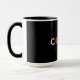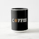 This mug features the word COFFEE in white lettering with the letter 'O' replaced by a brass toned token that is "Good for One Coffee". This coffee lover's mug is designed to be almost totally black inside and out with just hints of the white and brass accents.