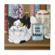 Black and white tuxedo cat just waking up on a kitchen counter top with his cat cook books, coffee mug, sugar and creamer.
