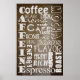 FUN TYPOGRAPY POSTER FILLED WITH COFFEE TERMS AGAINST BROWN TEXTURED BACKGROUND AND A HINT OF STEAM IN BACKGROUND