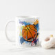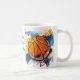 This ceramic coffee mug has an image of a art print of a basketball.