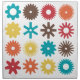 An attractive square arrangement of 16 different style cog wheels in a pallet of attractive colors.