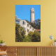 The image shows Coit Tower in San Francisco, California, rising above the surrounding buildings and trees. The tower is a light gray color and stands tall against a clear blue sky. In the foreground, there are residential buildings with a mix of architectural styles, including a building with a rounded, blue-trimmed facade and a modern building with a series of balconies.