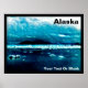 A stylized, blue monotone image of cold polar sea.. Ice hugs the coastal mountains. Customizable text reading, Alaska" also appears. Add your own additional text.