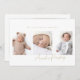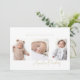 modern simple 4 photo collage script baby Announcement Card. This elegant card includes a photo collage of 3 photos on the front and 1 on the back with custom text and background.
