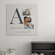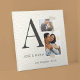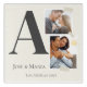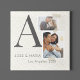 The Collaged Initials Stories acrylic wall art layers memory and design with a charcoal serif initial, one square photo, and one rectangular image stacked around it. Names and location appear below with washi tape accents on a white textured look background for a modern, heartfelt look.