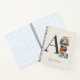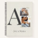 The Collaged Initial Stories notebook blends memory and design with a large charcoal serif initial, one square and one rectangular photo stacked nearby, and washi tape details that appear to hold each in place. Names and location rest below on a white textured-look background.