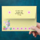 This envelope design features an adorable white rabbit with colorful Easter eggs. On the front the rabbit is peaking out of a basket surrounded by eggs and a flower border. On the back the rabbit is carrying the eggs. The flap of the envelope has an area for your return address. The inside liner has a repeat pattern of the white rabbit. This envelope coordinates well four card designs featuring the white and brown rabbit.