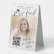 For family and friends who would like to give a cash gift to the graduate, a cute "College Pizza Fund" pedestal sign with two scannable QR codes provides a convenient mobile payment app option. The photos and wording on this template are simple to personalize, and can be different or the same on front and back. In addition, the colors are easy to change using the Zazzle design tool. Set out at a graduation party to add a stylish customized touch to the decorations. People who prefer contactless payment will appreciate the option to gift money from their digital wallet via their smartphone or tablet. The modern black and white design features trendy script calligraphy with a mortar board cap, elegant classic typography, 2 qr codes, and 2 photos of your choice, such as senior pictures or images from the commencement ceremony. This graduation party tabletop sign makes a unique and funny addition to a special day celebration. Congratulations to the graduate!