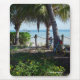 A colorful bike leans against a Palm tree, the ocean can bee seen in the background and yellow flowers in the front. Photographed in Florida. --- Photograph is copyrighted, by photographer: Christina Spiegeland.