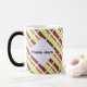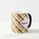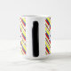 Magic mug features a tiled Colombian Flag with the word COLOMBIA below, in the colors of the flag with a black border. A white fractal of squiggly squares holds a place for your name. Use it to create a custom gift or a personalized look for yourself. The flag is yellow, blue, and red with the top half in yellow and the bottom half sharing the blue and red stripes..
