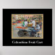 Woman fruit vendor waits for customers for her juicy red and yellow mangos. The cart behind her is selling fresh papayas. The luscious fresh fruit offerings in Colombia are mouth watering.