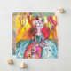 Colorful,whimsical,vibrant Venetian masquerade character. Sophisticated blonde woman is sitting with a feathered mask in hand with sparkling gold,silver, blue,teal fabrics of a baroque masked ball costume with feathers and floral sparkles in white,pink, yellow colors .