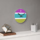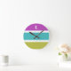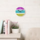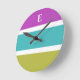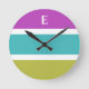 A modern wall clock with striped color block design in pink, green, blue and white. Personalise the clock with your initial, which will appear as a monogram at the top of the clock face. A stylish gift in contemporary style.