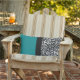 This trendy outdoor lumbar pillow features large rectangular color blocks in teal green and a silver and black leopard print, divided by a narrower black color block in the center.
