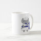 Do you like cute mugs? Do you like cats? This adorable mug has a gray cat wearing a blue and white color guard uniform with a blue flag.