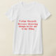 My overall review is that the T-shirt is nice, it fits true to size however the font is significantly smaller than advertised and you can't read it. The printing is unreadable and there is a strain to read it. It does not look like the advertised product. Maybe the shirt color is darker or a larger more visible font should have been used. Photos with and without flash and font is barely legible.