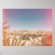 This full-color poster features a monolithic wall of boulders in Joshua Tree National Park. The foreground of this California desert is speckled with green bushes and agave, all accented by pink saturated light flares, creating a beautiful and hip piece of art for any modern home or dorm.