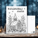 Coloring postcard with a Christmas theme. Celebrating Jesus. Pretty church with stained glass and a snowy background.