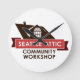 The color Seattle Attic Community Workshop logo on a wall clock.