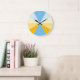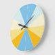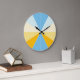 A clock face divided into 12 x 30 degree segments each divided with a white line and in a palette of 5 colors with adjoining segments at the top and bottom using the same color creating symmetry and adding emphasis to the hours and half hour, looking rather like a pie chart.