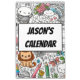 A customizable kids' calendar cover design featuring a whimsical doodle background filled with charming animals, rainbows, flowers, and playful objects like colored pencils and butterflies. At the center, a bold panel showcases the text "Jason's Calendar," easily personalizable for any name. The art style is cheerful and inviting, perfect for a young audience.