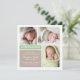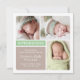 Announce your newest arrival with this fresh green and taupe color-block birth announcement card. The modern square design showcases three newborn photos alongside an "Introducing" banner and stylish script and serif name typography. A soft sage green and neutral taupe palette suits a baby boy or girl, with a solid green back. All text is fully customizable.