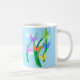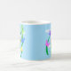 Coffee mug with my summery design of six butterflies in purple, green, blue, orange, pink and yellow on blades of grass under a blue sky with puffy white clouds.