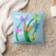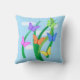 Throw pillow with my design of six butterflies in purple, green, blue, orange, pink and yellow on blades of grass under a blue sky with puffy white clouds.