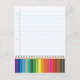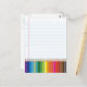 A background of a typical loose leaf, school notebook page, with a bank of colored pencils across the bottom of the page.