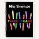 Start out the new school year with this Third Grade notebook which can both be used by teachers and students. The design consists of 7 different colored pencils at different angles next to each other with the word "Third Grade" across them. This note book can be personalized by changing the name on it, and would make a great back-to-school gift.