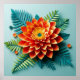 Vibrant, intricately crafted flower made of paper, featuring bright orange and yellow petals with a central turquoise core.
