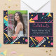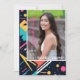 Step into the vibrant world of the '80s with our retro-inspired graduation announcement invitation! Against a backdrop of deep navy blue, bursts of neon pink, electric blue, and lime green form abstract shapes reminiscent of the era's iconic aesthetics. Front and center, a cherished photo captures the essence of your achievement, radiating pride and accomplishment. Turn the invitation over to discover two more snapshots, showcasing the journey that led to this momentous occasion. Amidst the lively hues, our invitation message beckons: