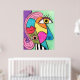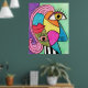 This bright, colorful poster was created with my original abstract chalk pastel art featuring a cubism design with big eyes and red lips in a cheerful pink, green, blue, yellow, purple color block design with a touch of black and white stripes.