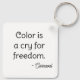 From the painting Carnaval, this vibrant keychain features an abstract multicolored face in pixel art. The quote on the back, "Color is a cry for freedom.", celebrates bold self-expression and artistic freedom. A bright statement piece to carry with you.