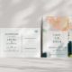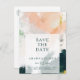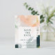 This colorful abstract save the date postcard is perfect for your unique modern boho wedding. Hand-painted with textured brush marks of dark emerald green, peach, and mustard, all overlayed with a minimalist transparent square, it's sure to give your occasion a simple yet rustic bohemian feel.