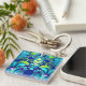 This unique abstract keychain features symmetrical fractal art in vibrant colors: blue, cyan, green, and purple.