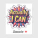 Bring the bold vibes with this colorful Actually I Can sticker in a fun comic-inspired style. Perfect for laptops, water bottles, planners, notebooks, or phone cases. Printed on durable glossy vinyl with vivid colors that pop. A great little daily boost for go-getters and dreamers alike. Stick it somewhere you will see it and remind yourself — Actually, you CAN.