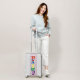 A fun and friendly luggage with a colorful vertical text using the Hawaiian greeting of " aloha " against a pink background. Can be 'Customize it' to your choice of colors for the handles, luggage background, and wheels.