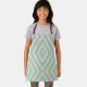 "Colorful apron with a vibrant geometric pattern of concentric diamonds in shades of blue, green, pink, and yellow. Displayed on a plain background and worn by a smiling person in a gray sweater."